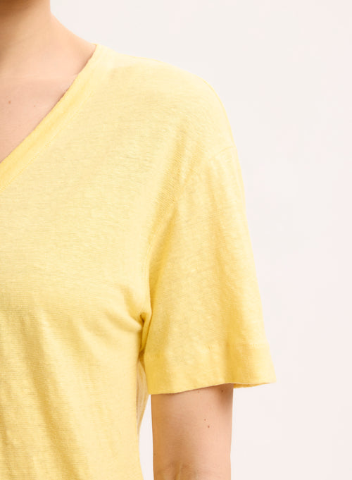T-shirt Jaune Col V Manches Courtes en Lin / Elasthanne